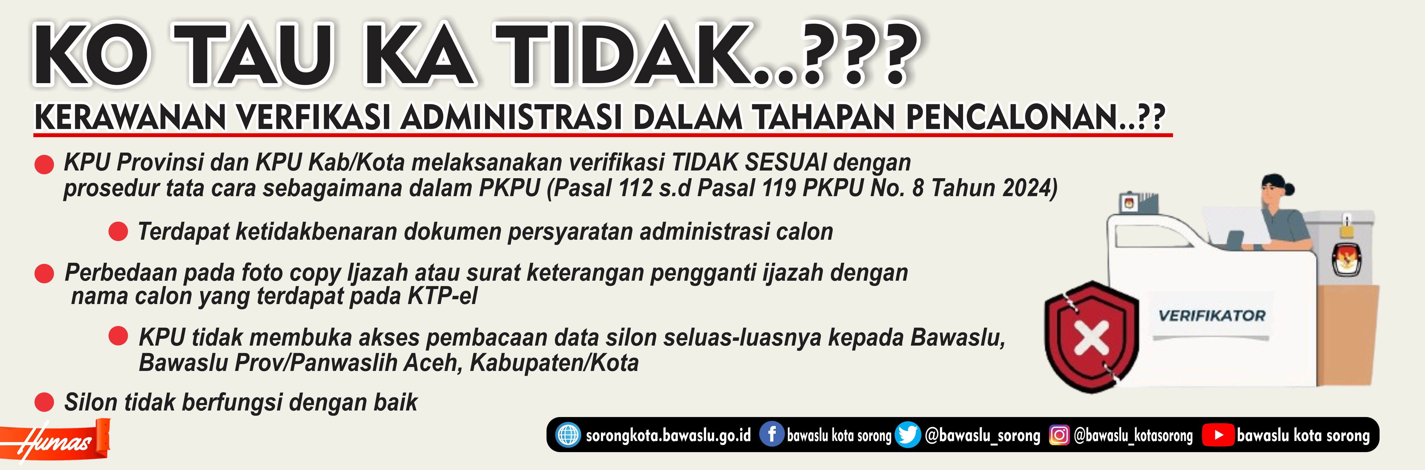 Pengumuman Contoh Pengumuman Lihat Selengkapnya Lapor Pelanggaran Pemilu Hasil Pengawasan Tahapan Pemilu 2024 Ajukan Permohonan Sengketa Proses Pemilu Bagaimana Cara Ikut Awasi Pemilu Lapor Hoaks Pemilu Apa Saja Yang Diawasi Pada Tahapan Pemilu Berita Bawaslu kota Sorong Hadiri Evaluasi Penguatan Kelembagaan usai pemilu dan pilkada serentak 2024. humas Selasa, Agustus 26, 2025 - 13:19 Bawaslu Kota Sorong Gelar Pelatihan Kehumasan humas Sabtu, Januari 21, 2023 - 21:19 Nasir Sukunwatan Ajak Kelompok Cipayung Awasi Tahapan Pemilu 2024 humas Kamis, Desember 1, 2022 - 14:28 Awasi Tahapan Pemilu, Bawaslu Kota Sorong MoU Bersama IJTI dan PWI humas Kamis, Desember 1, 2022 - 13:27 Bawaslu Kota Sorong Lantik 30 Panwaslu Kecamatan humas Sabtu, Oktober 29, 2022 - 02:15 https://sigaplapor.bawaslu.go.id/ https://ppid-sorongkota.bawaslu.go.id https://sips.bawaslu.go.id/ https://google.com https://jdih.bawaslu.go.id/ Galeri Pendaftaran Pasangan Calon Walikota dan Walikota Sorong Pada Pemilihan Tahun 2024 Pencarian Saran dan Pengaduan Saran dan pengaduan dengan untuk kemajuan Bawaslu Ajukan