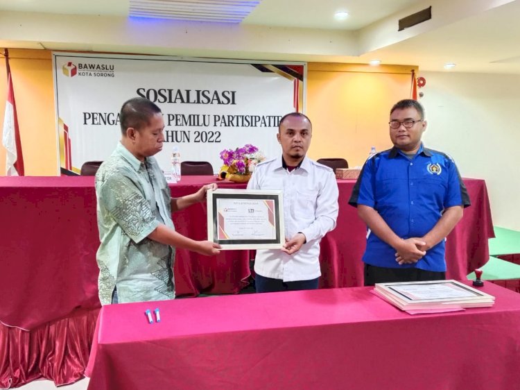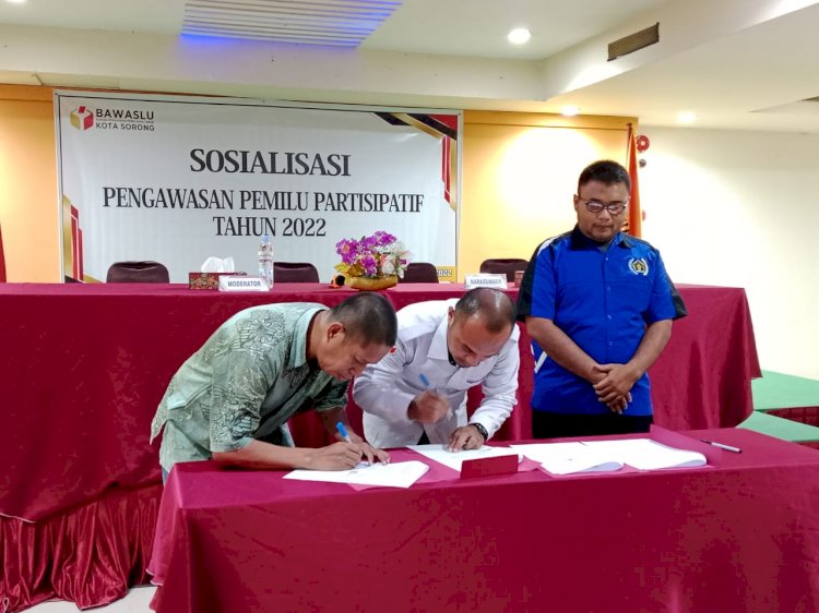 KOTA SORONG, – Bawaslu Kota Sorong melakukan penandatanganan Memorandum of Understanding (MoU) bersama Ikatan Jurnalis Televisi Indonesia (IJTI) Papua Barat dan Persatuan Wartawan Indonesia (PWI) Sorong.