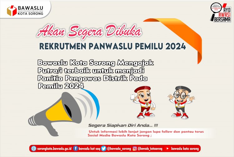 KOTA SORONG - Bawaslu Kota Sorong akan segera membuka rekrutmen anggota Panitia Pengawas Pemilu (Panwaslu) Distrik, pada Pemilu serentak tahun 2024. Panwaslu ini nantinya bekerja untuk melakukan pengawasan tahapan Pemilu 2024 di tingkat distrik.