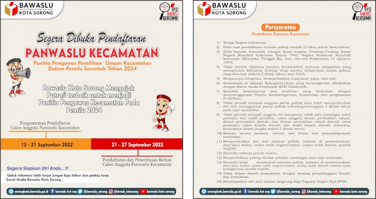 KOTA SORONG, - Bawaslu Kota Sorong mengajak masyarakat untuk mendaftarkan diri sebagai calon anggota Panitia Pengawas Pemilu Kecamatan, untuk melaksanakan Pengawasan tahapan Pemilu tahun 2024 di tingkat Distrik se Kota Sorong.