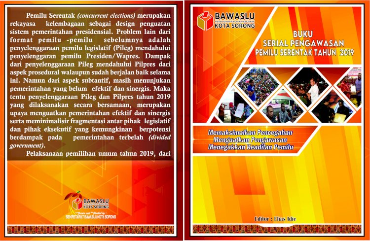 Badan Pengawas Pemilu (BAWASLU) sebagai salah satu lembaga Penyelenggara Pemilu selalu berkomitmen untuk menjaga kemurnian suara rakyat dan menegakkan keadilan pemilu. buku serial pengawasan ini, selain menyajikan hasil kerja pengawasan tahapan Pemilu di Kota Sorong, Buku ini juga penting dibaca oleh oleh para pemangku kepentingan (elit politik), mahasiswa dan masyarakat umum yang terus peduli terhadap kualitas pembangunan demokrasi di Indonesia.